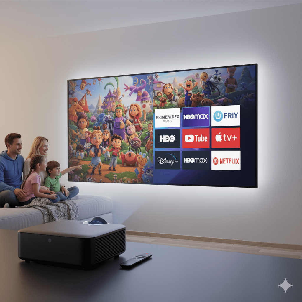 Profitez de Netflix, YouTube, Prime Video, et bien d’autres – tout est déjà intégré, aucun appareil supplémentaire nécessaire. Appuyez simplement sur play.